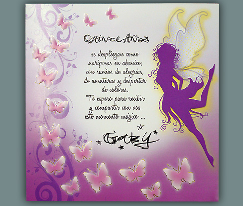 Hada violeta, y mariposas en alto relieve, en tonos fucsia y rosa con finos ribetes de oro metalizado.